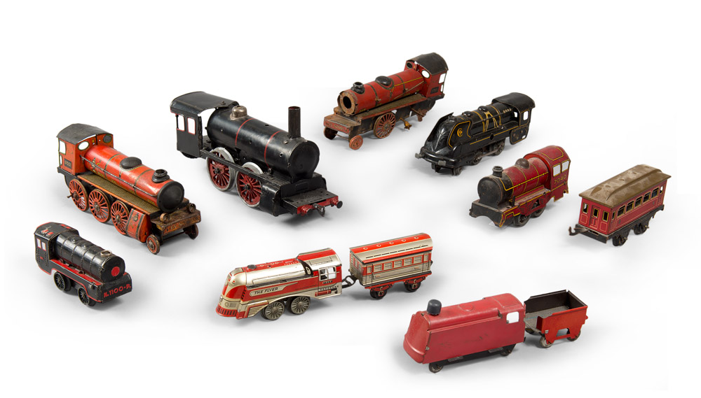 GRUPPO DI OTTO GIOCATTOLI D'EPOCA composto da modellini di locomotive in latta e ferro verniciati, alcuni con chiave a molla Misure varie Marchi vari: Ingap, Padova - Made in England - Made in Western Germany - Made in Bavaria - Unis, Made in France