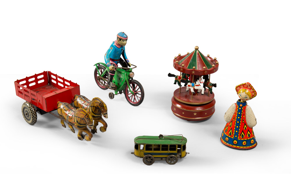 GRUPPO DI CINQUE GIOCATTOLI D'EPOCA composto da bambolina russa, giostra, motocicletta, carro trainato da cavalli e vagone in latta, ferro e legno verniciati, alcuni con chiave a molla Misure varie Marchi vari: Ingap, Padova - MAR, Made in Britain