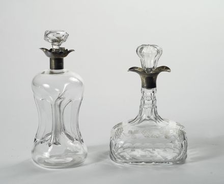 Due flaconi in vetro di varia forma, con becco in argento, Inghilterra XX sec.