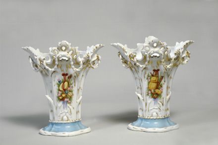 Due vasi in porcellana policroma , dipinti sul fusto con composizioni floreali e strumenti musicali, Vecchia Parigi, XIX sec. h. cm. 25,5