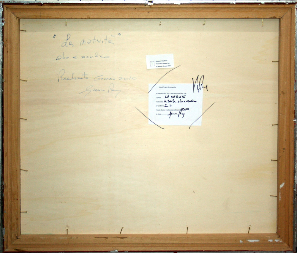 Graziano Rey 1953, Torino (To) - [Italia] La natività cementite e smalti su tavola 70x80 cm 2010 firma dell’artista in basso al centro e sul retro; con cornice dipinta certificato di autenticità firmato dall'artista