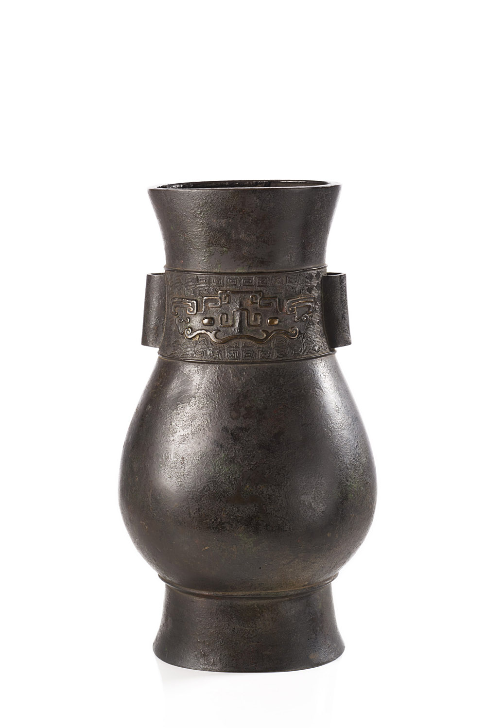 Vaso in bronzo di forma arcaica hu con anse tubulari e decorato con maschere taotie (difetto) Cina, dinastia Ming (1368-1644) A bronze vase of arcaich form, hu, with twin tubular handles, decorated with taotie masks (losses) China, Ming dynasty (1368-1644) (h. 30 cm.)