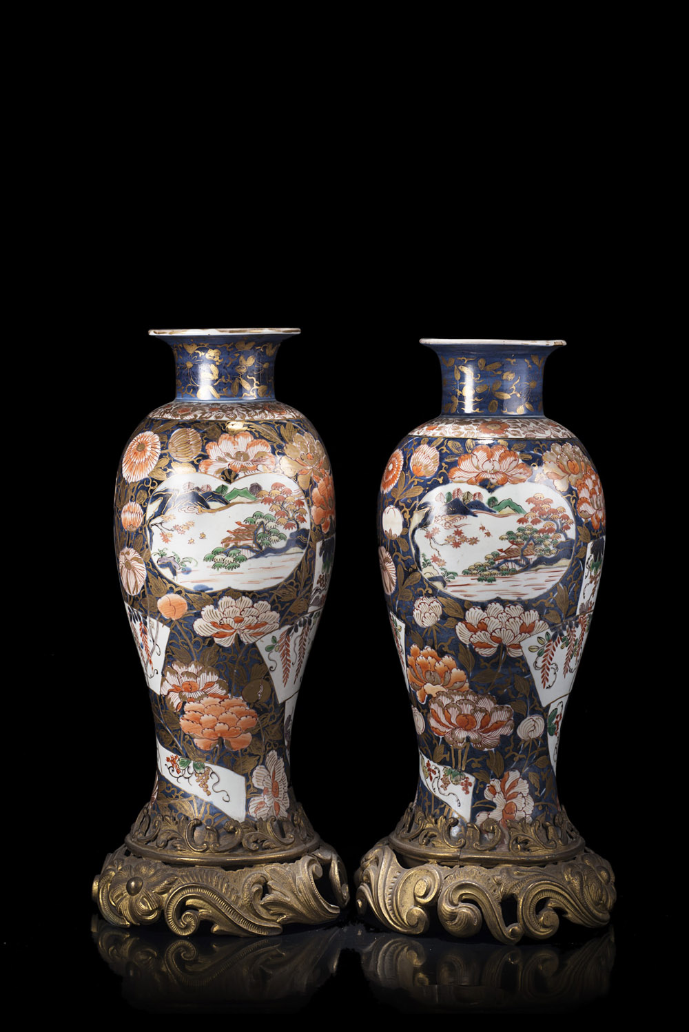 Coppia di vasi a balustro in porcellana Imari, decorati con fiori e motivi geometrici con lumeggiature dorate, con basi in bronzo dorato Giappone, sec. XVIII A pair of Imari baluster vases, each enamelled and gilt with flowers, geometric motifs and auspicious characters, with gilt bronze bases Japan, 18th century (la porcellana/the porcelain h. 47 cm.)