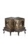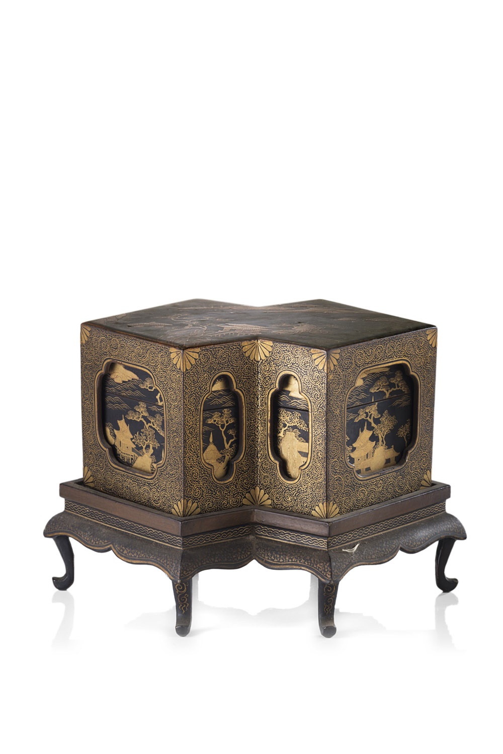 Scatola laccata in nero e oro, a forma di doppia losanga su elaborato piedistallo, decorata con scene di paesaggi con pagode, contornate da ricchi motivi geometrici e floreali Cina, sec. XIX A double-lozenge lacquer box, on an elaborate base, decorated in black and gilt with pagodas in landscape scenes, surrounded by rich geometric and floral motifs China, 19th century (l. 27 cm.)