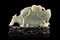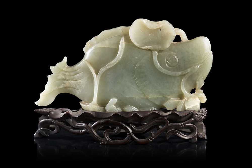 Carpa in giada color celadon, tra fiori di loto e flutti, con base in legno Cina, tarda dinastia Ming (1368-1644) A celadon jade carp amongst lotus and waves, with wood base China, late Ming dynasty (1368-1644) (l. cm. 18,5)