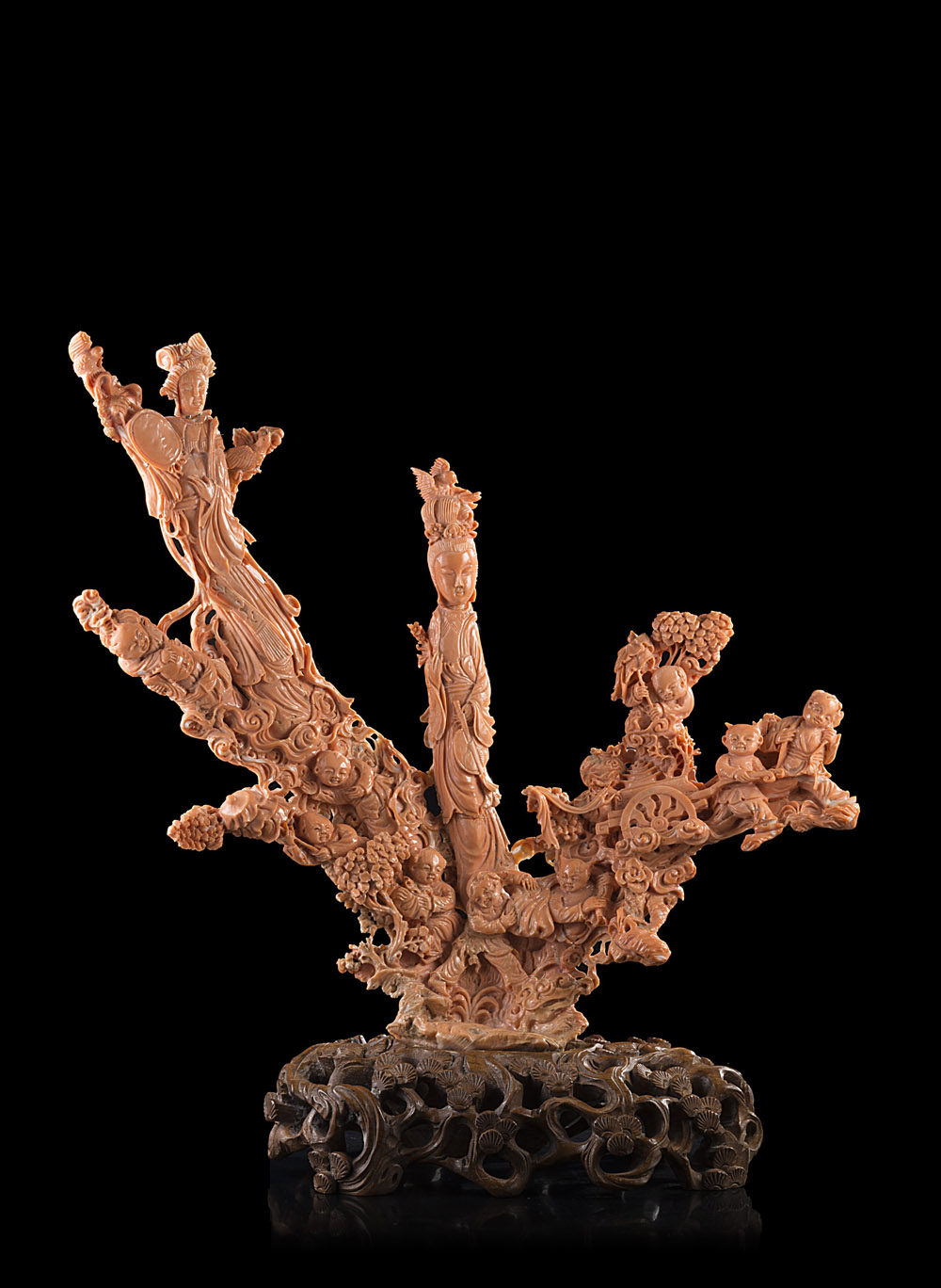 Ramo in corallo intagliato con figure femminili dalle lunghe vesti accompagnate da fanciulli giocosi in processione (difetti) Cina, metà sec. XX A pink coral branch carved with beautiful ladies wearing long robes and accompanyed by playful children in a procession (losses and repairs) China, mid-20th century (h.45 cm.; 1100 gr.)