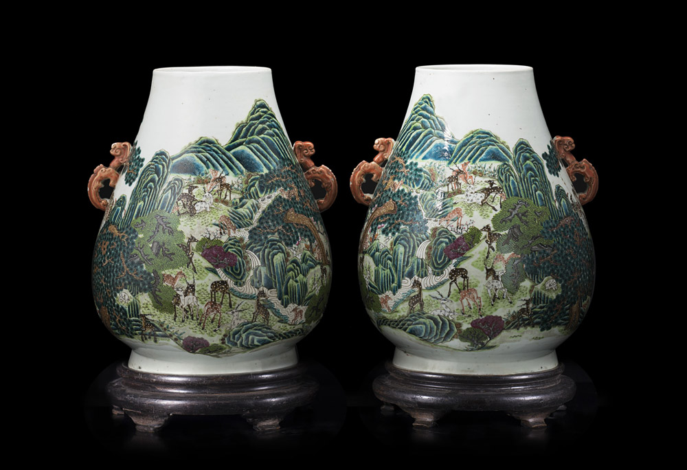 Coppia di vasi decorati con il motivo dei "cento cervi", dalla caratteristica forma arcaica hu, adornati da doppie anse color corallo con dettagli dorati, ognuno dipinto con vividi colori raffiguranti un branco di cervi dal manto marrone a macchie bianche al pascolo in un paesaggio ricco di alberi di pino con ruscelli e montagne in lontananza, ciascuno con marchio apocrifo Qianlong sul fondo Cina, epoca Guangxu (1875-1908) Per questo lotto è disponibile l'Attestato di Libera Circolazione A pair of 'hundred deer' vases, of archaistic hu shape, flanked with twin iron-red and gilt handles, each painted in vivid enamels with a heard of deer with white-spotted brown coats at graze in a landscape with pine trees and streams and mountains in the distance, each with apocryphal Qianlong mark to the base China, Guangxu period (1875-1908) Export license is available for this lot (h. 46 cm.)