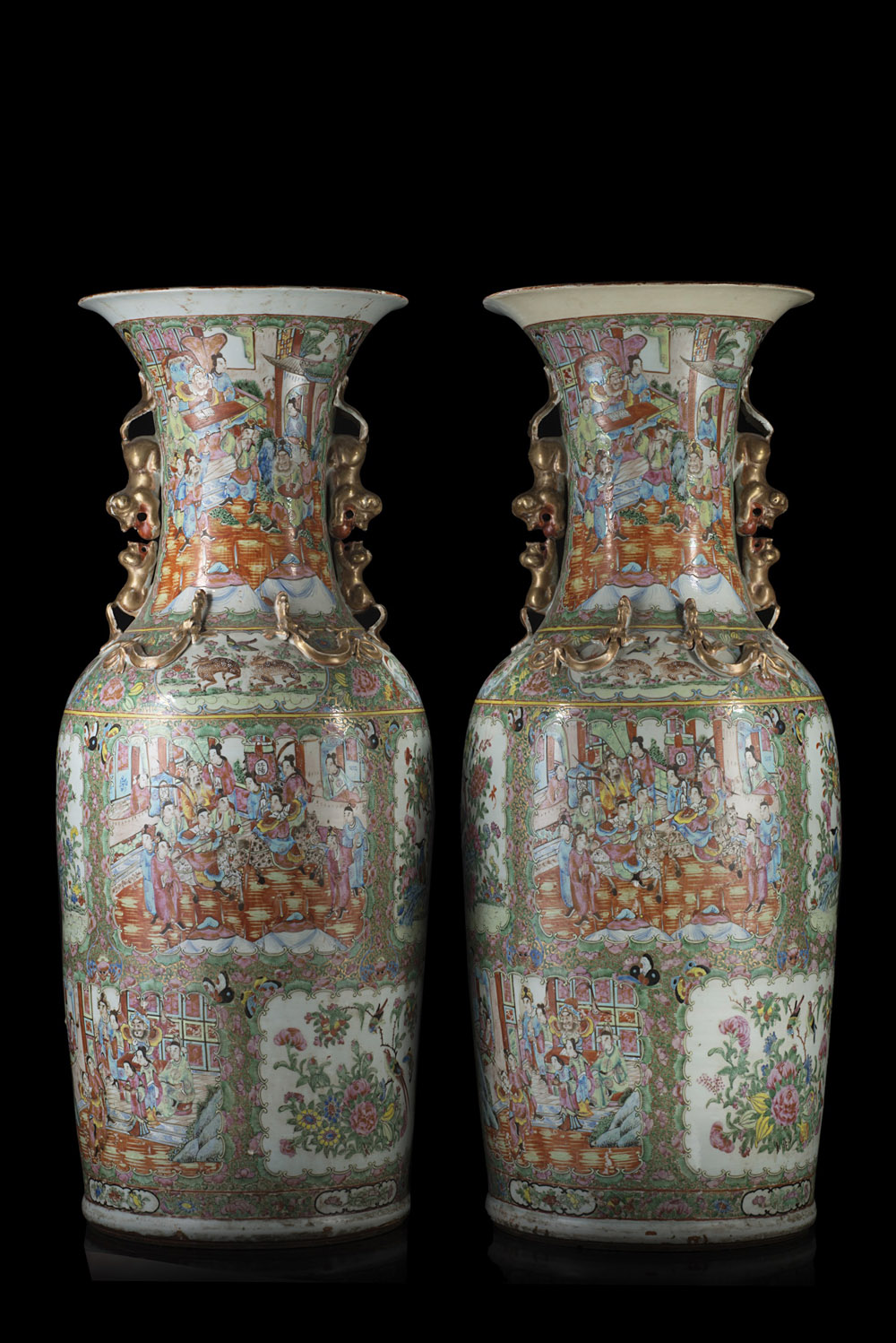 Coppia di grandi vasi a balustro in porcellana Famiglia Rosa cantonese, con doppie anse a guisa di leoni buddhisti e con chilong applicati decorati con figure in scene di palazzo, volatili e fiori (difetti) Cina, sec. XX A pair of large cantonese Famille Rose vases, each with twin buddhist lion handles and applied chilongs, decorated with figures in interior scenes, birds and flowers (losses) China, 19th century (h. 90 cm.)