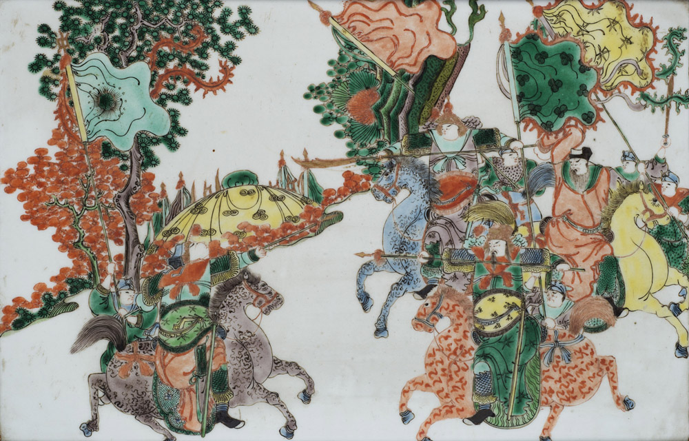 Coppia di placche rettangolari in porcellana Famiglia Verde, decorate con scene di guerrieri armati a cavallo in battaglia, con cornice in legno Cina, sec. XIX A pair of rectangular Famille Verde plaques, each decorated with armed warriors on horses engaging in battles, with wood frames China, 19th century (la porcellana/the porcelain 38,5 cm. x 25 cm.)