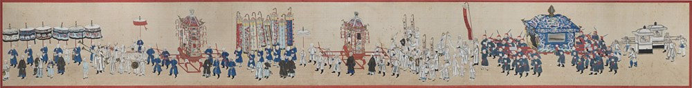 Dipinto di figure in processione, alcune con vesti bianche, altre sorreggono baldacchini e stendardi Inchiostro e colori su seta, con cornice e montatura Cina, fine sec. XIX A painting of figures in procession, some wearing white clothes, others carrying banners and canopies Ink and colours on silk, mounted and framed China, late 19th century (26x202 cm.)