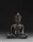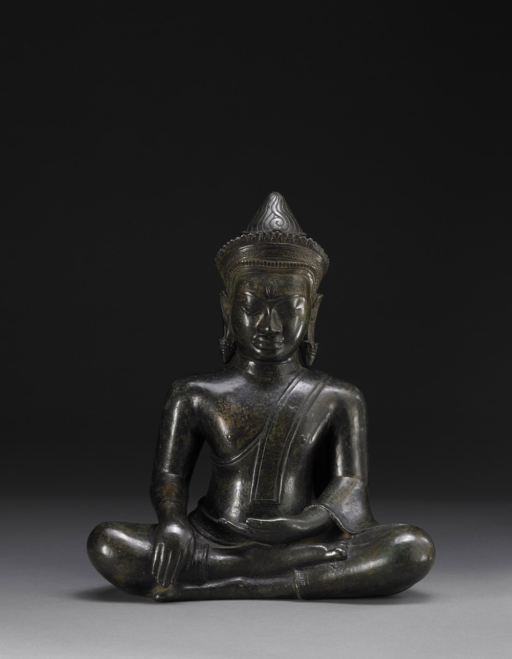 Buddha in bronzo raffigurato seduto a gambe incrociate, una corona sul capo, le orecchie con pendenti incorniciano il volto sereno, le mani in Bhumisparshamudra, le vesti con delicati drappeggi Cambogia, XVIII/XIX secolo A bronze Buddha depicted cross-legged, a crown on his head, the ears with pendants, a serene facial expression, the hands in Bhumisparshamudra, the robes gently draping the body Cambodia, 18th/19th century (h 37 cm.)