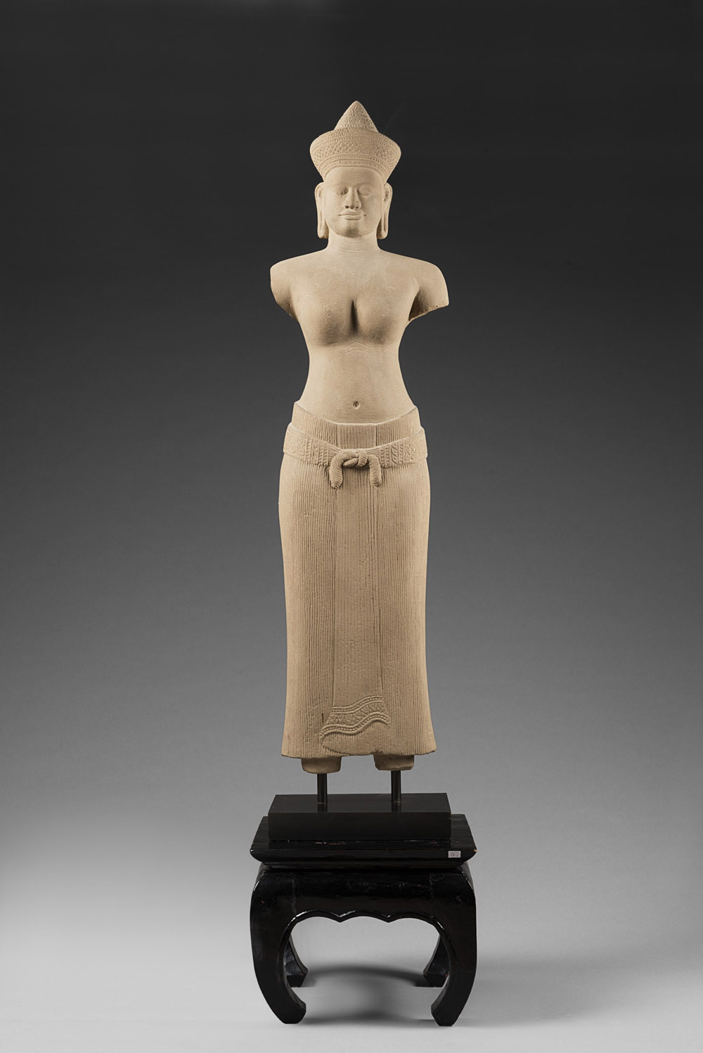 Lot 1118 | Statua di divinità in pietra grigia, con base in legno A grey stone deity,...
