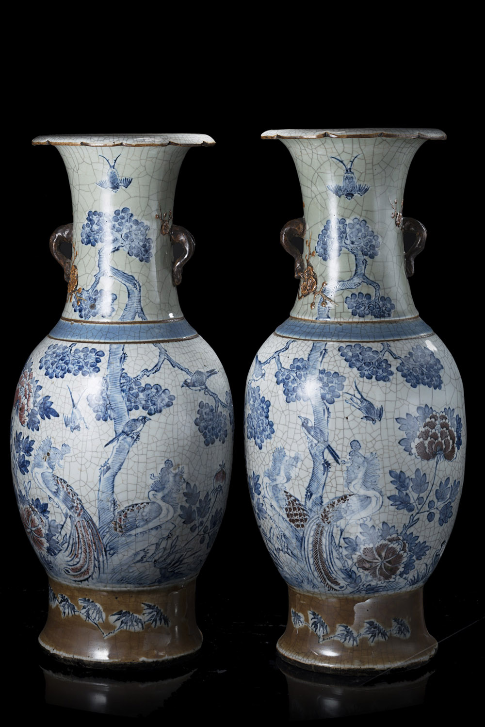 Coppia di vasi in porcellana con decoro a rilievo bianco e blu di uccelli su rami in fiore su fondo marron chiaro e verde celadon, con craquelere Cina, fine XIX/inizio XX secolo A pair of porcelain vases decorated to the ovoid body with blue and white birds perched on flowering branches on a light brown and green celadon ground with fine crackling China, late 19th/early 20th century (h. 61 cm.)