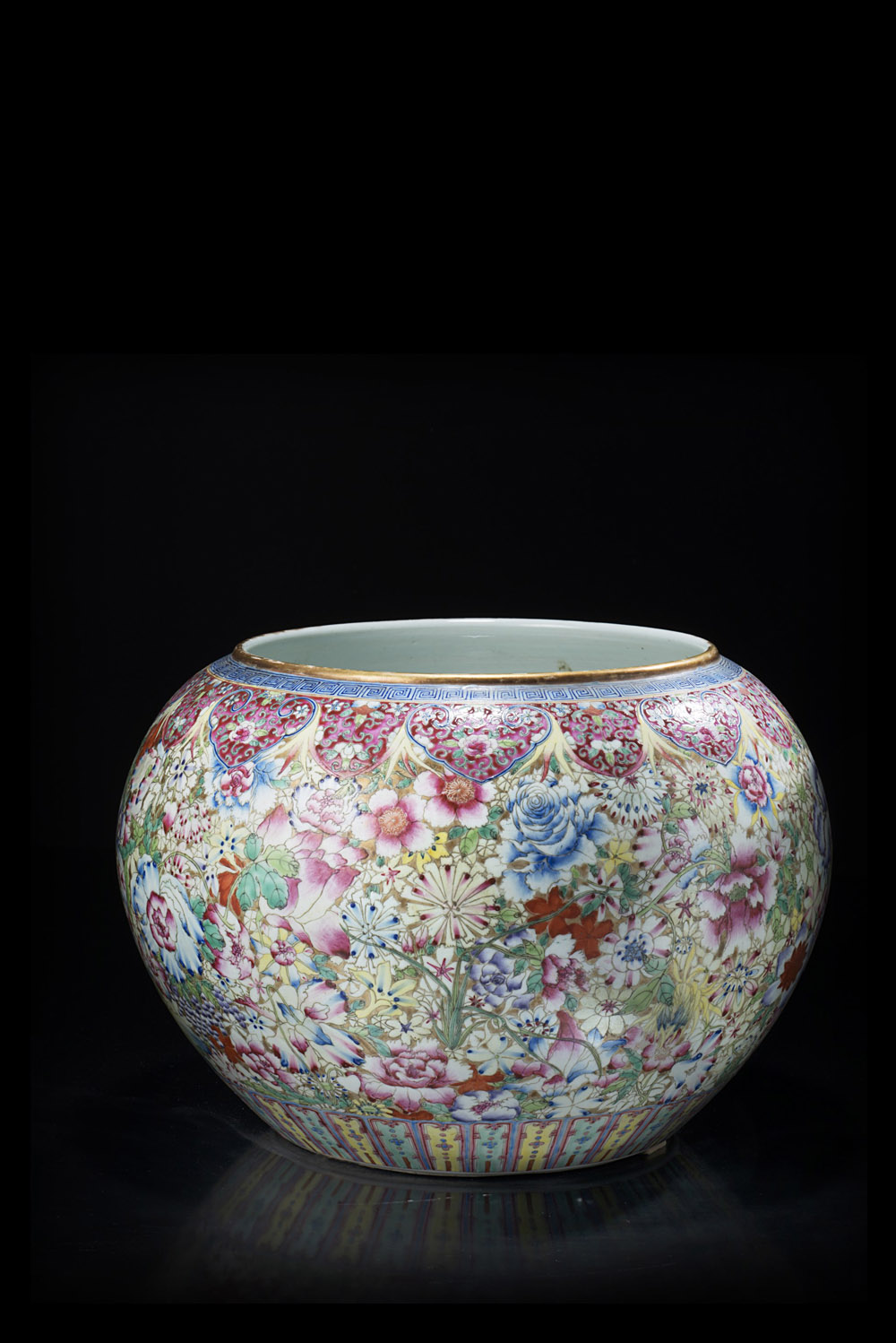 Potiche in porcellana con decorazione 'millefiori' su fondo dorato e bande geometriche Cina, sec. XIX A 'millefleurs' globular bowl, decorated with various flowers on a gilt ground and geometric bands China, 19th century (h. 26 cm.)