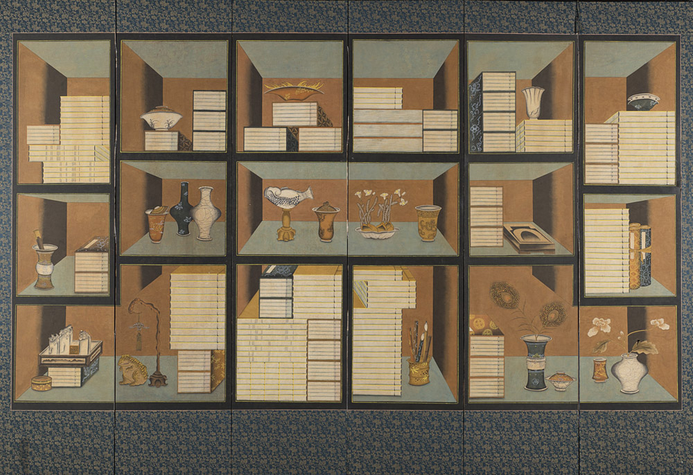 Paravento a sei ante decorato con oggetti preziosi in una scena d'interno, inchiostro e colore su carta e montato su seta (lievi difetti) Giappone, sec. XX A six-leaves folding screen decorated with precious objects in interiors, ink and colours on paper, mounted on silk (minor losses) Japan, 20th century (242x133 cm.)
