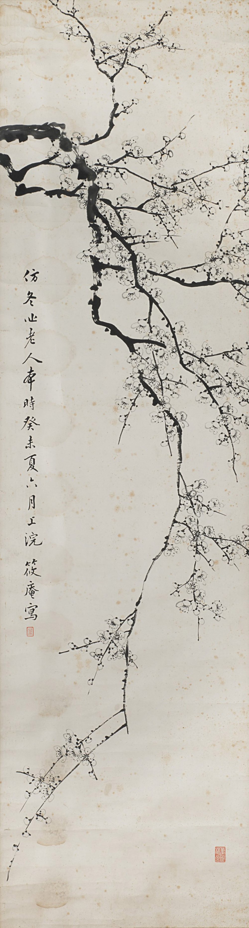 Dipinto raffigurante un ramo di pruno in fiore, accompagnato da iscrizioni e sigillo, inchiostro su carta, montato su seta, con cornice Cina, sec. XIX A painting of a flowering prunus branch, with inscriptions and seal, ink on paper, mounted on silk and framed China, 19th century (37x136 cm.)