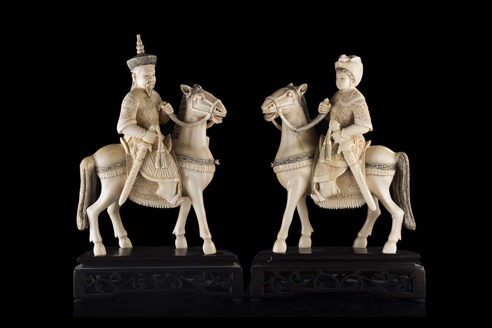 Coppia di sculture in avorio raffiguranti dignitari a cavallo, indossano...