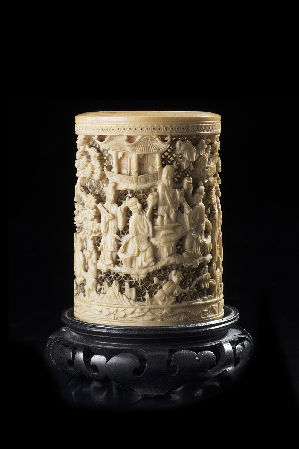 Portapennelli in avorio lavorato con motivo di figure tra alberi e pagode, base in legno Cina, sec. XIX An ivory brushwasher, carved and pierced with figures amongst trees and pavilions, with wood base China, 19th century (h. 10,5 cm.)