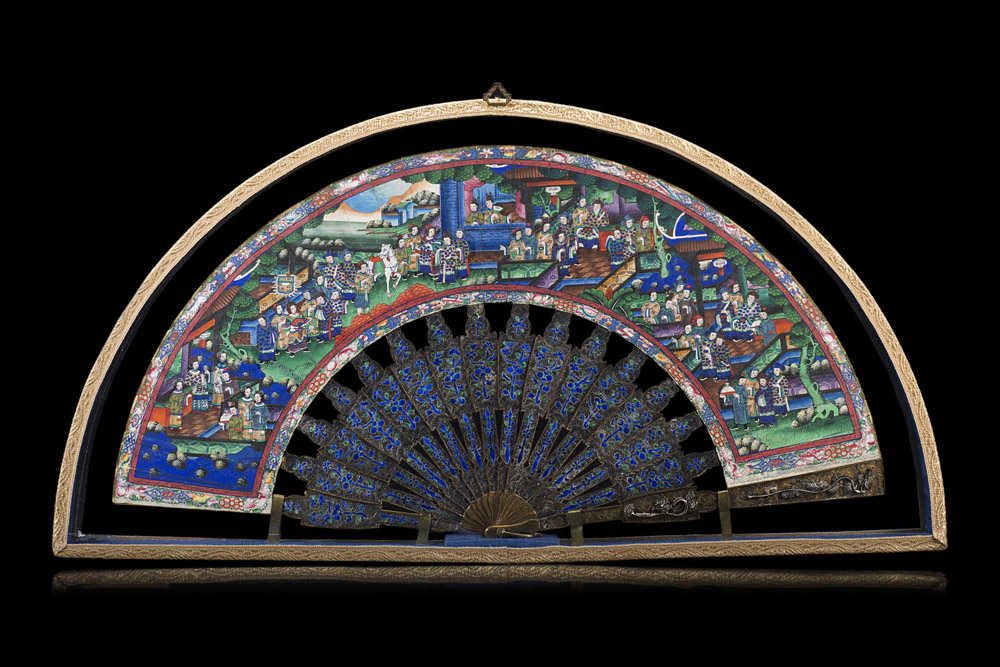 Grande ventaglio con stecche in filigrana d'argento, dipinto con figure in paesaggio, i visi realizzati in avorio, con teca Cina, prima metà sec. XIX A large painted folding fan, the stick in silver filigree, with painted decoration and ivory details, with case China, first half of the 19th century (l. 53 cm.)