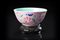 Ciotola in porcellana decorata con fiori policromi su fondo rosa, l'interno turchese, marchio apocrifo Guangxu sul fondo, con base in legno Cina, sec. XX A small porcelain bowl decorated with flowers on a pink ground, the interior turquoise, with apocryphal Guangxu mark to the base China, 20th century (diam. 11,5 cm.)