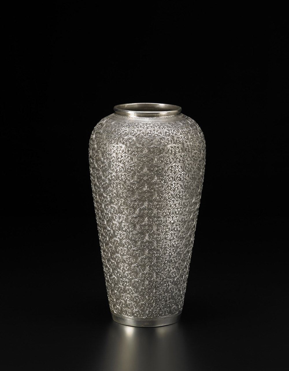 Vaso in argento stampato, sbalzato e cesellato di forma affusolata, con decorazione geometrica Birmania, XIX/XX secolo A silver tapering vase, finely decorated with geometric motifs Burma, 19th/20th century (h. 27 cm.)