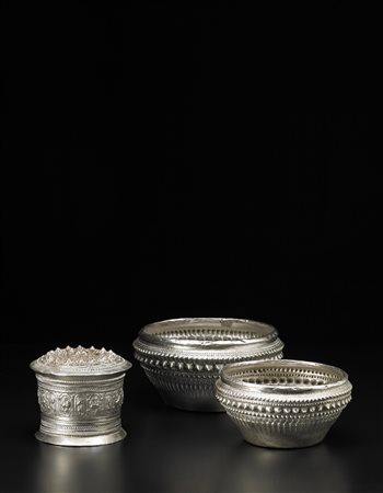 Due ciotole e una scatola in lega d'argento con lavorazione a sbalzo e cesello con decorazioni geometriche Laos, XIX/XX secolo Two bowls and one cylindrical box and cover in metal and silver, richly decorated with geometric motifs Laos, 19th/20th century (diam. 20, 17, 13 cm.) (gr. 300, 200, 200)