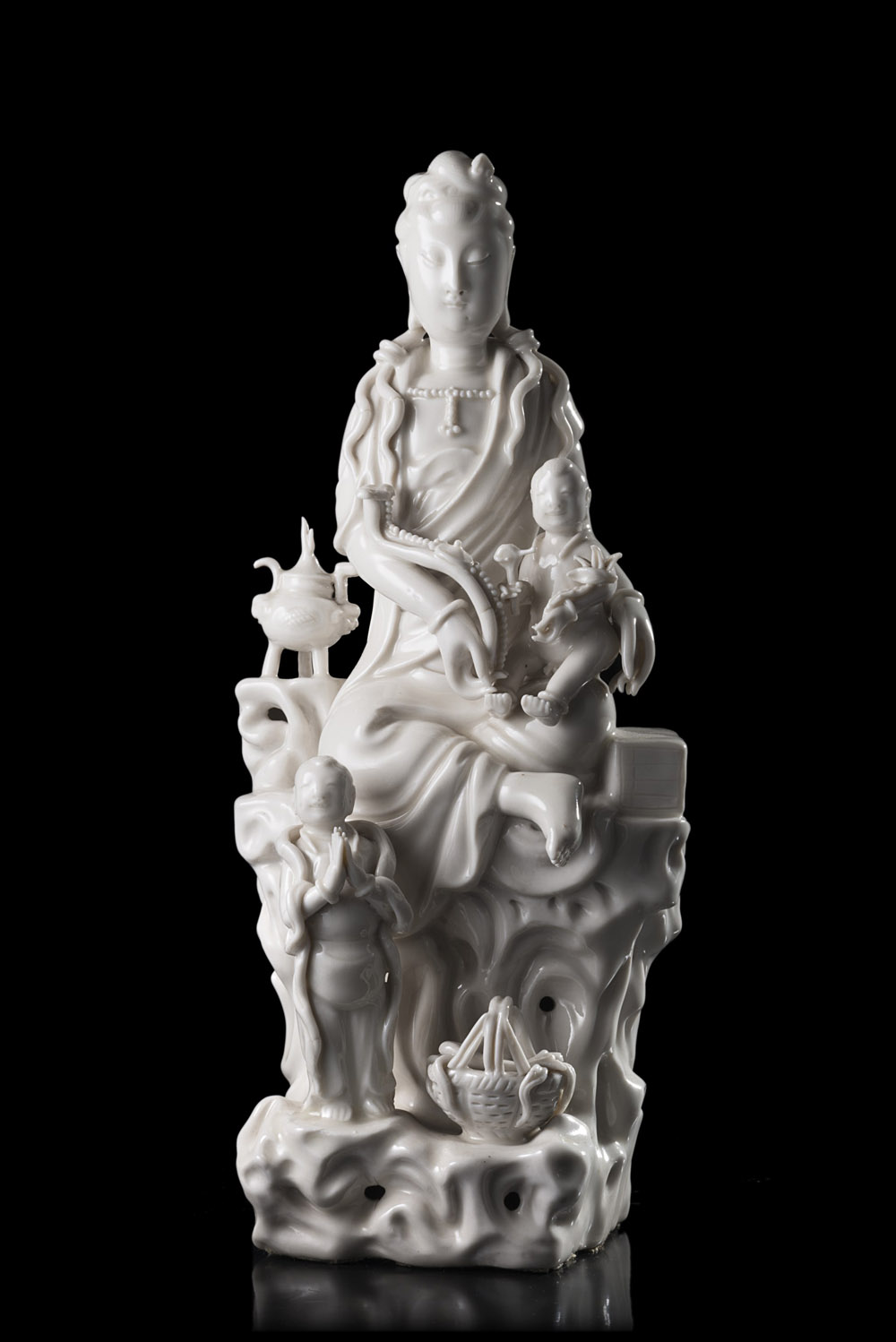 Gruppo in porcellana Blanc-de-Chine raffigurante Guanyin con fanciulli (lievi...