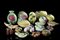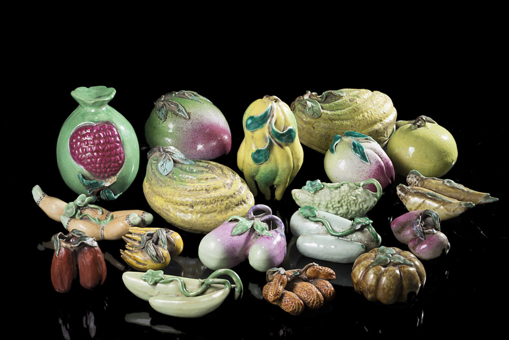 Gruppo di diciotto piccole sculture in porcellana policroma, composto da pesche, melograno, limoni e altri frutti Cina, fine sec. XVIII/inizio dec. XIX A group of eighteen polychrome porcelain models compring peach, pomegranate, finger citron and other various fruits and vegetables China, late 18th/early 19th century (l. max. 11 cm.)
