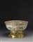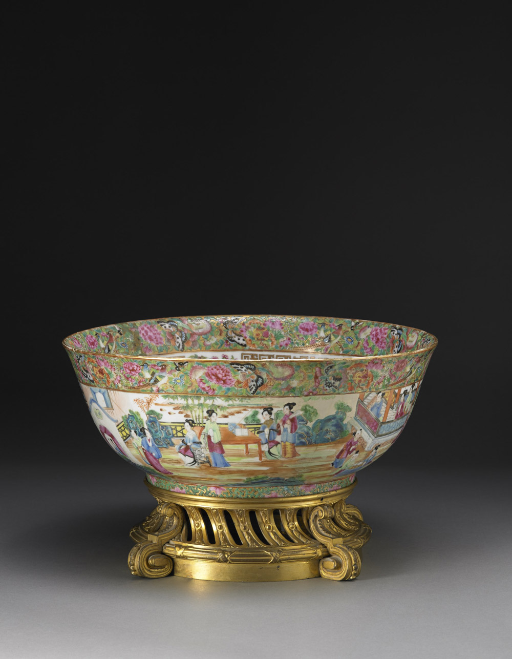 Grande bacile in porcellana Famiglia Rosa cantonese, decorato con figure in varie attività di palazzo circondate da denso decoro floreale e con uccelli (area con restauro), base in bronzo dorato Cina, sec. XIX A Cantonese Famille Rose porcelain punch bowl decorated in enamels and gilt with figures in interiors scene surrounded by a rich floral decoration and birds (repairs to one area at the rim), gilt bronze stand China, 19th century (diam. 37 cm.)