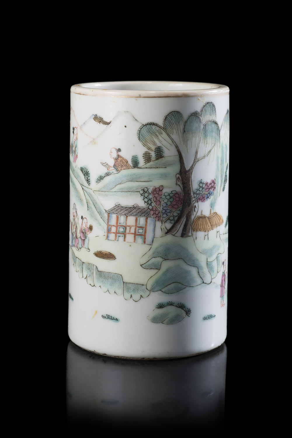Portapennelli cilindrico in porcellana Famiglia Rosa, decorato con scene di paesaggio con figure e pagode Cina, sec. XX A Famille Rose cylindrical brush pot, decorated with figures in a landscape scene China, 20th century (h. 12 cm.)