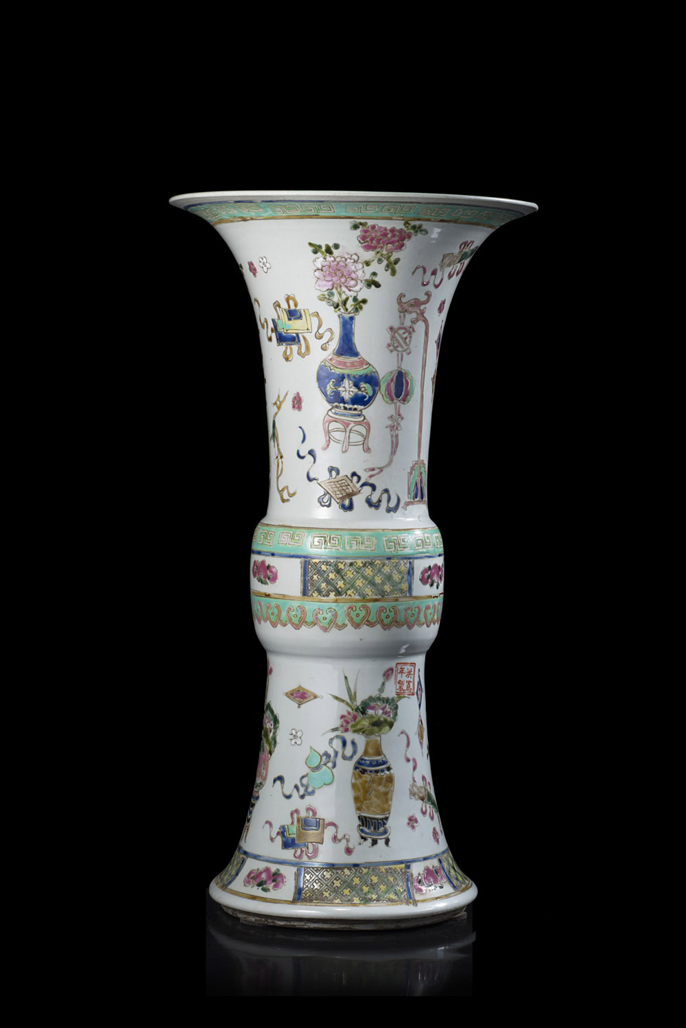 Vaso in porcellana Famiglia Rosa, di forma arcaica gu, decorato con oggetti preziosi, simboli Buddhisti e fiori, l’interno turchese Cina, sec. XX A Famille Rose vase, of archaistic gu shape, enamelled with precious objects, Buddhist symbols and flowers, the interior turquoise China, 20th century (h. 55 cm.)