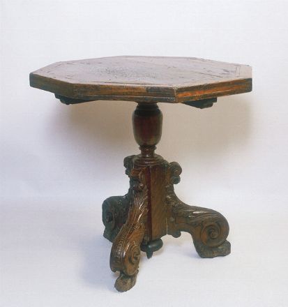Tavolo ottagonale in noce, gamba tornita su tre piedi intagliati, (restauri),...