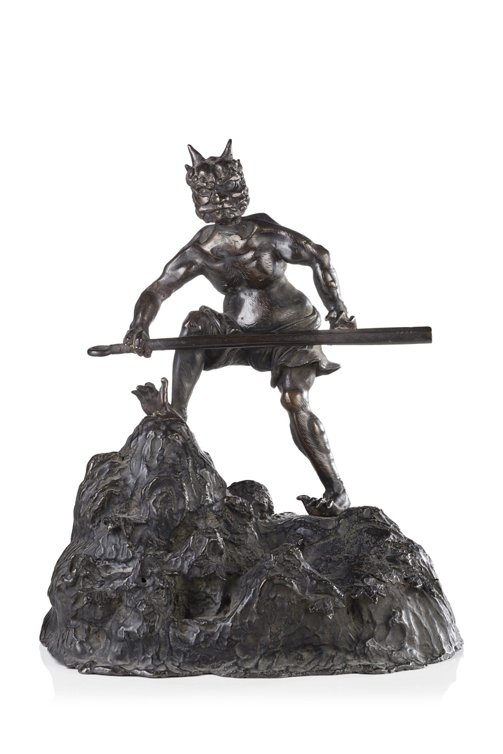 Demone in bronzo su roccia, il viso con espressione minacciosa Giappone, periodo Meiji (1868-1901) A bronze demon standing on rocks, with fierce facial expression Japan, meiji period (1868-1901) (h. cm. 21,5)