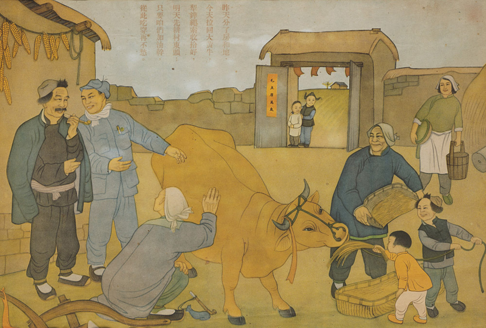 Quattro stampe propagandistiche a colori su carta, con scene di vita quotidiana, montate e incorniciate (alcuni difetti) Cina, anni '50 Four propaganda colour prints on paper, of various daily life subjects, mounted and framed (some losses) China, mid 50s (48x34 cm.)