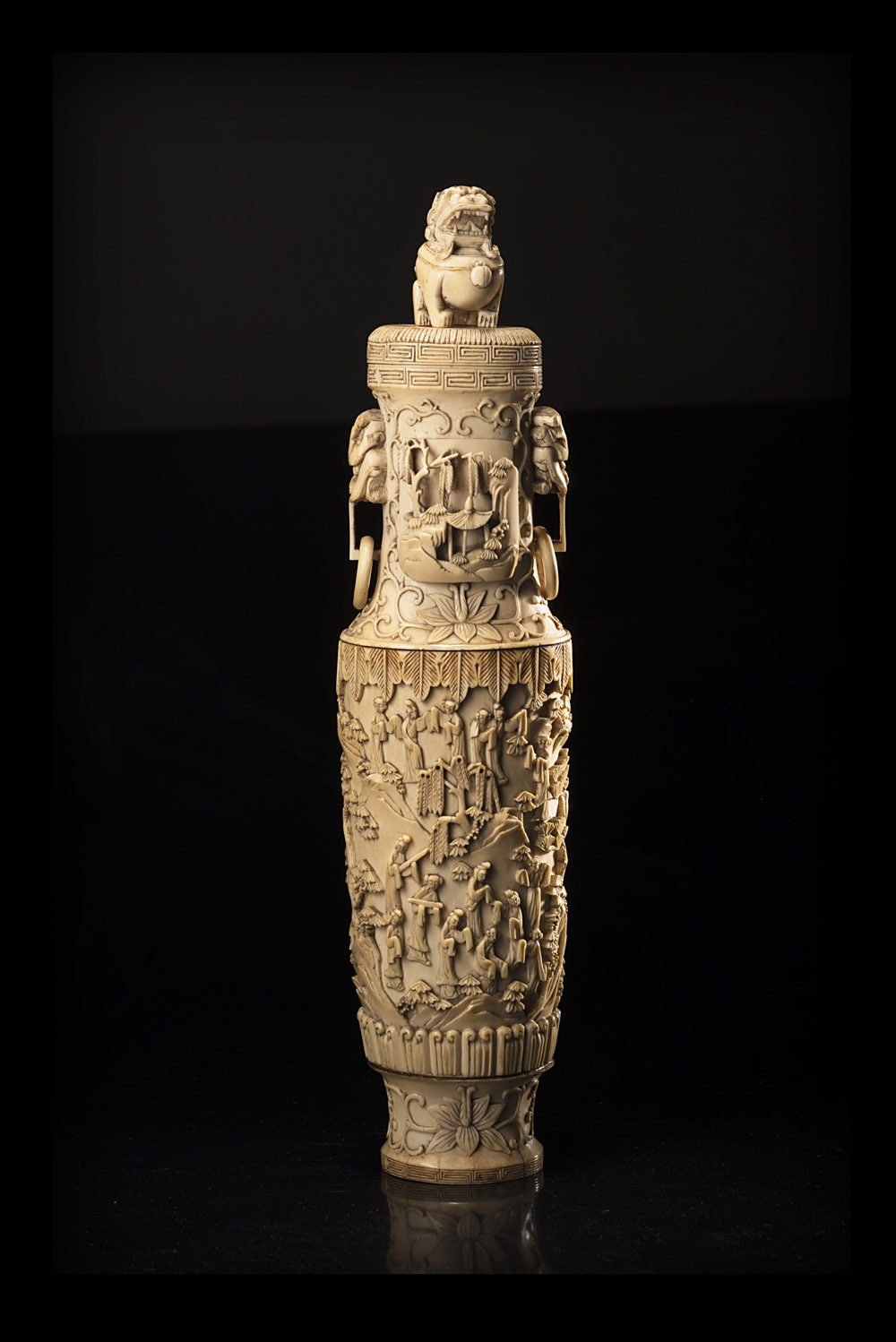Vaso in avorio, con coperchio sormontato da leone buddhista, con doppie anse...