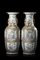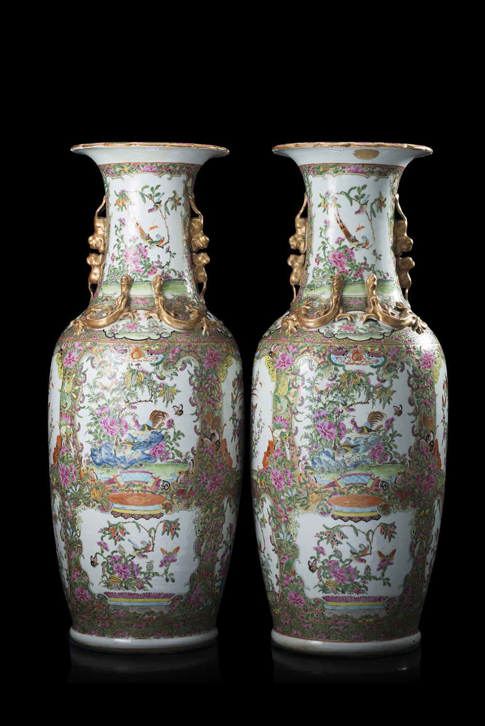 Coppia di vasi in porcellana Famiglia Rosa cantonese, con draghi dorati a rilievo, decorati con vari pannelli con figure, fiori e uccelli, su fondo bianco e dorato (uno danneggiato e restaurato nella parte superiore) Cina, sec. XIX A pair of Cantonese Famille Rose porcelain vases, with dragons applied to neck, decorated in gilt and enamels with panels enclosing figures, flowers and birds (one with a crack to the mouth, one section restored) China, 19th century (h cm 65)