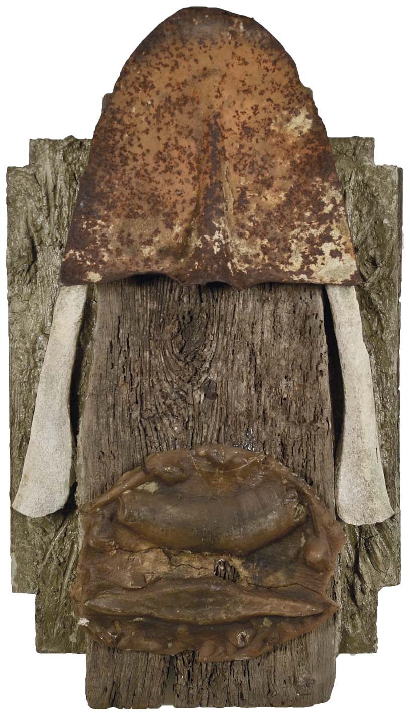COSTA CLAUDIO Tirana (Albania) 1942 - Genova 1995 Totem 1980 supporto legno antico con collage, badile arrugginito, ossa bianche, calchi in cera 73x49x8 firma data e titolo al retro Artevalori S.r.l Genova