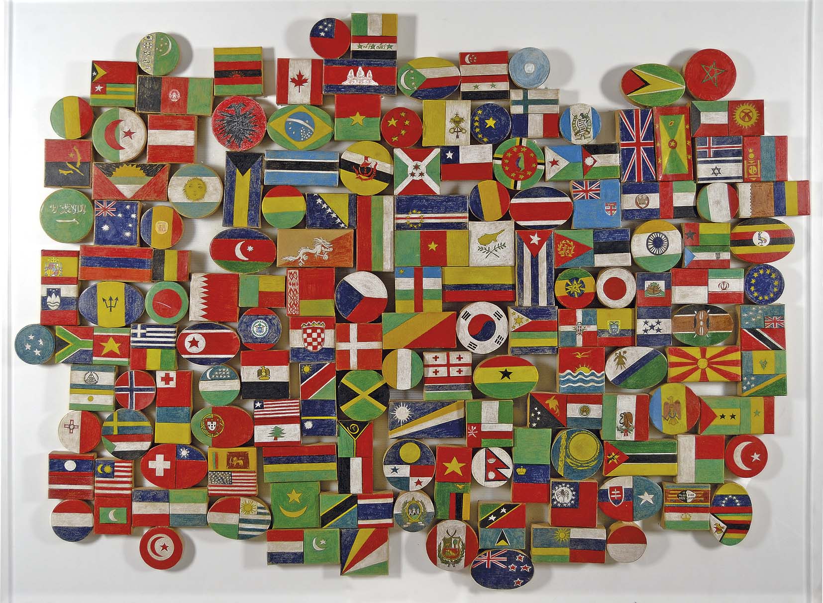 PEZZI PAOLA Brescia 1963 Bandiere disegnate a matita del mondo 2009 matite colorate su cartone 115x154,5 firma data e titolo al retro autentica dell'Autore su foto "Così forte Arte al femminile nell'età contemporanea" Padiglione delle Arti Marcon VE 2015 - etichetta al retro