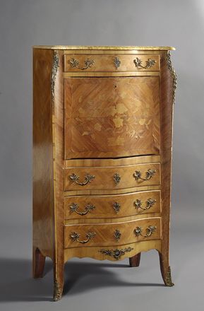 Secretaire listrato e intarsiato in legni da frutto, mosso sul fronte e sui fianchi a quattro cassetti e una ribalta, con applicazioni in metallo dorato e traforato, Francia, XIX sec., cm. 136x71x45