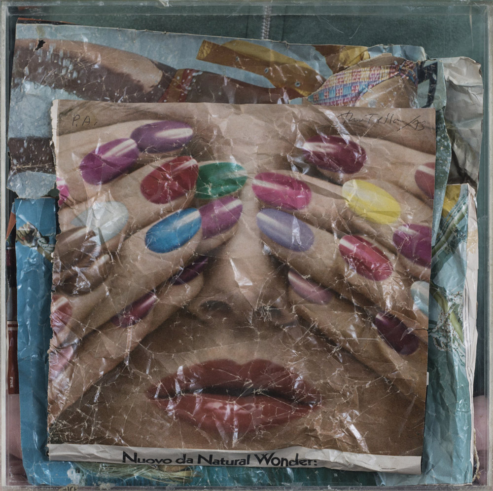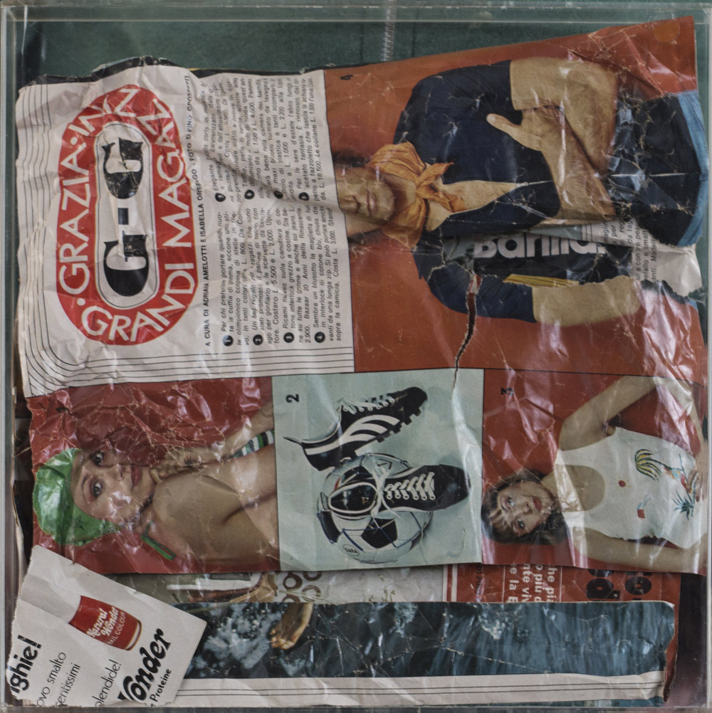 Collage di carte di rivistea sotto plexiglass