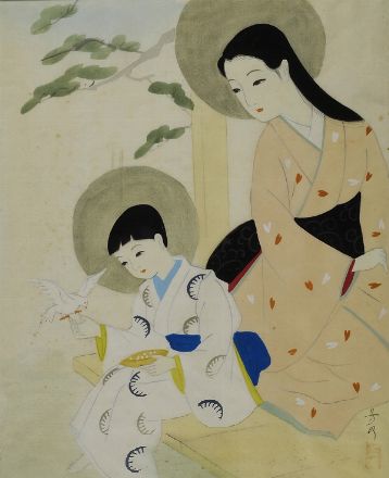 Lot 212 | Madre e figlio tempera su seta, Firma in basso a destra. Giappone, prima metà...