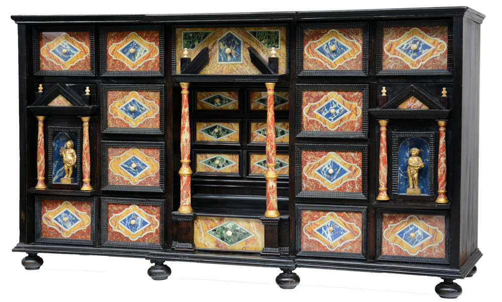 Monetiere in ebano a otto cassetti riquadrati da cornici guillochet, pannelli dipinti a finti marmi policromi, due grandi laterali di struttura architettonica con cimasa a timpano e decorati da sculture in legno dorato. Parte centrale con cassetto alla base sormontato da colonne a tutto tondo e cinque cassetti riquadrati da sagome e cassetto superiore riquadrato da cornici. Pomoli in avorio, piedi a sfera schiacciata. In parte del sec. XVII (cm 124x70x39)(difetti) Ebony cabinet. Partly of the 17th century (defects)