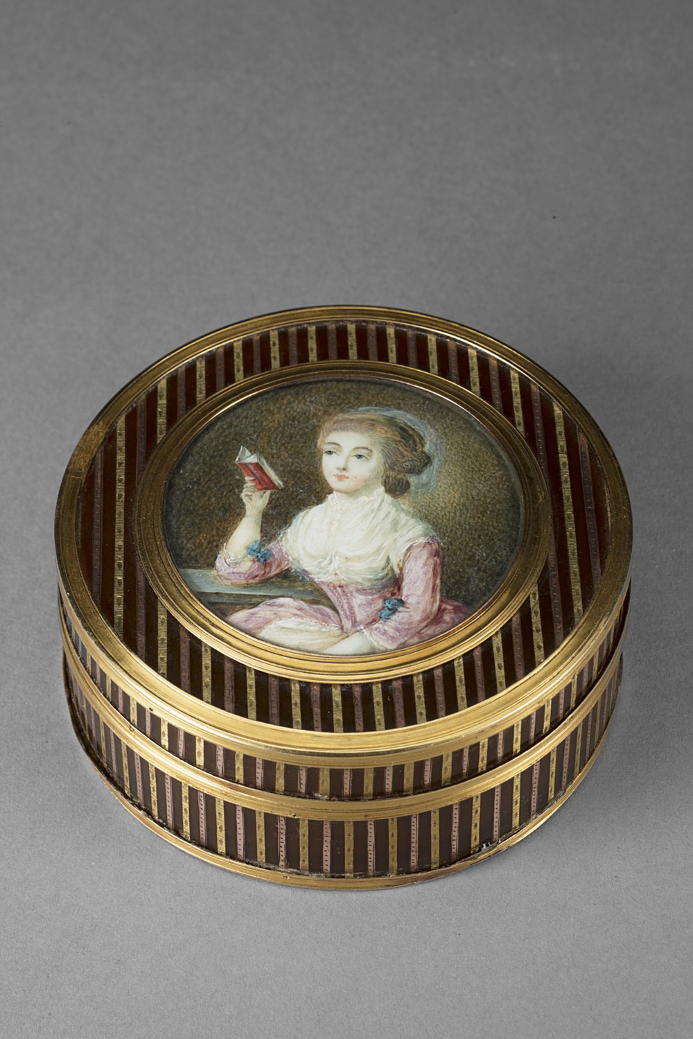 Tabacchiera di forma tonda con coperchio decorato da miniatura raffigurante...