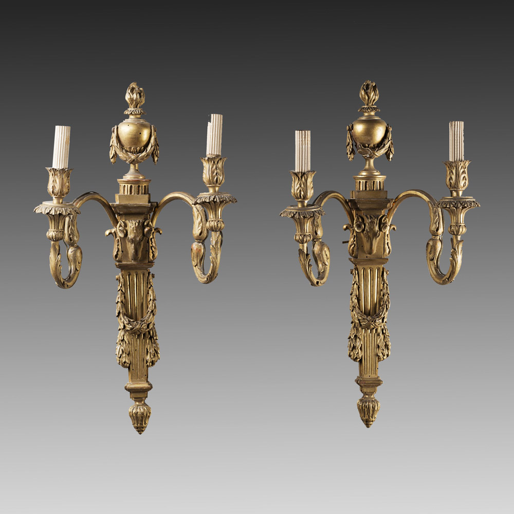 Coppia di appliques a due fiamme in legno intagliato e dorato a motivi vegetali, fusti scanalati scolpiti a teste di ariete e vasi biansati con fiamme. Fine sec. XVIII (h. cm 54) (difetti alla doratura) Pair of late 18th-century giltwood appliques (defects)