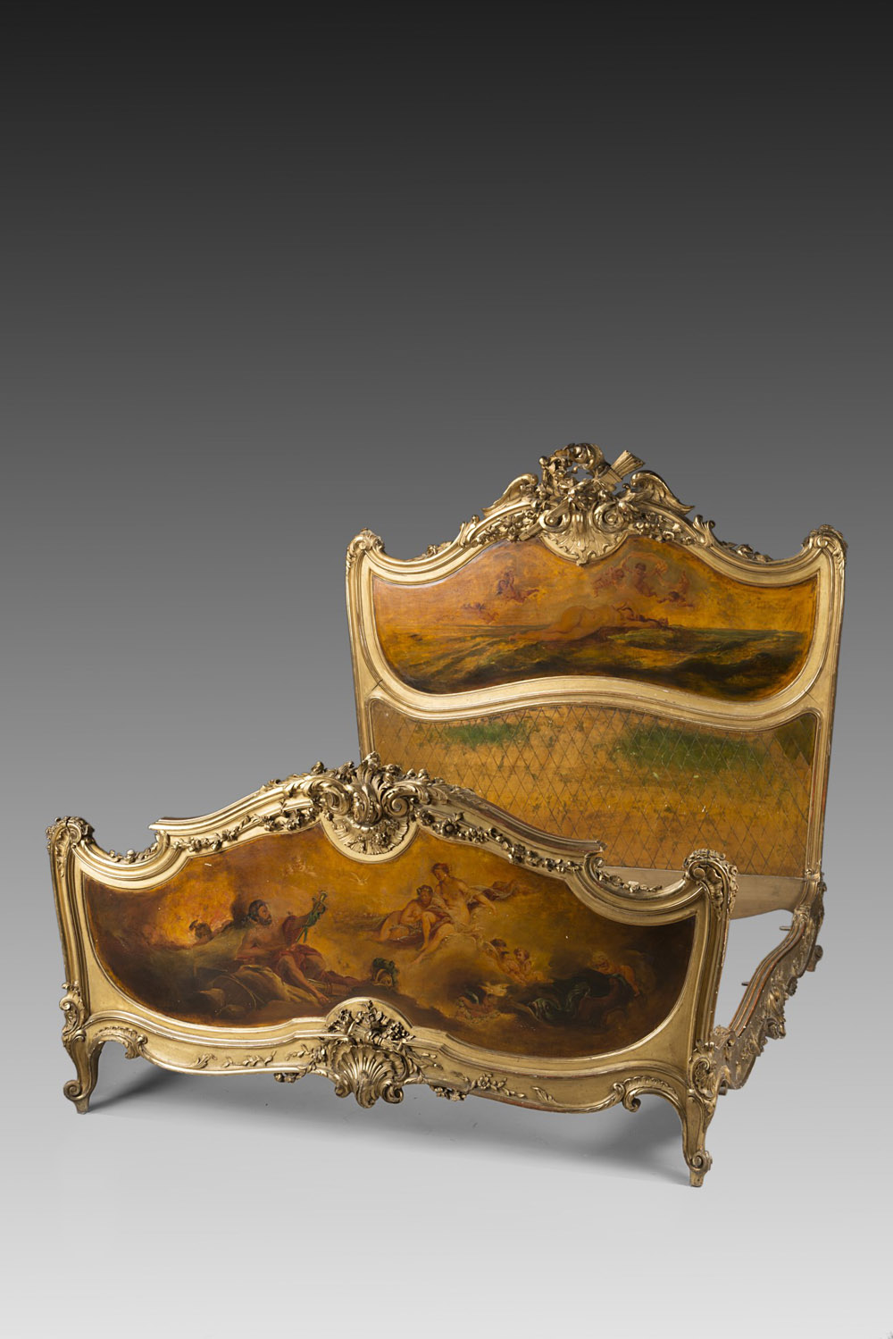 Letto eclettico a due piazze in legno scolpito e dorato, con spalliera e pediera dipinte con scene allegoriche. Inizio sec. XX Early 20th-century sculptured gilt-wood bed