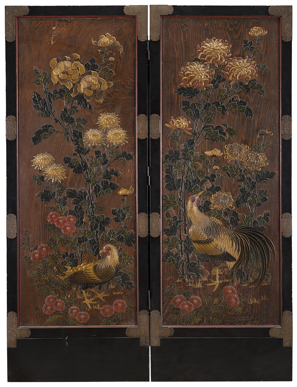 Paravento da centro a due ante in legno laccato e dorato in policromia a fiori e volatili. Cornice in legno ebanizzato decorato da applicazioni in rame inciso a motivi vegetali. Giappone, sec. XIX (difetti e mancanze) (cm 175x130) 19th-century Japanese lacquered gilt-wood screen (defects and minor losses)