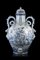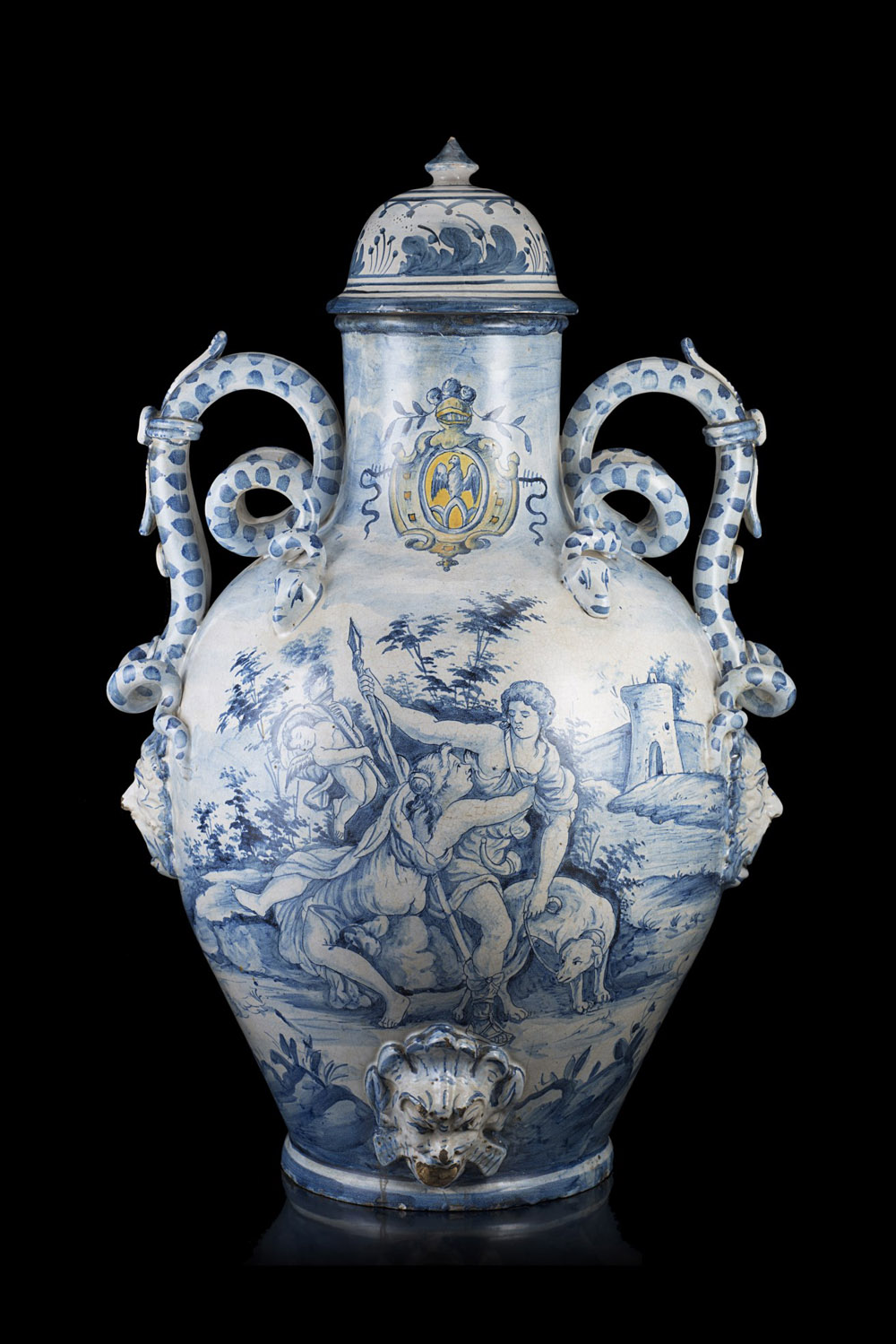 Manifattura ligure sec. XIX. Grande vaso biansato in maiolica decorato nei toni del blu a scena mitologica in un paesaggio e a stemma nobiliare in policromia. Anse a tutto tondo a forma di serpenti avviluppati decorate con mascheroni all'attacco. Rubinetto nella base in rilievo con volto di figura fantastica (h. cm 65) (lievi difetti) (coperchio di epoca posteriore) Large 19th-century Ligurian majolica vase with tap fitted in the base (minor defects) (cover of later date)