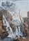 Maestro romano del secolo XVIII "Paesaggio con cascate di Tivoli" tempera su...