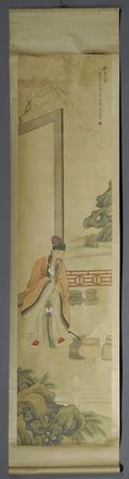 Dignitario in giardino Scroll verticale in seta dipinta, Cina, Fine XIX sec.,...