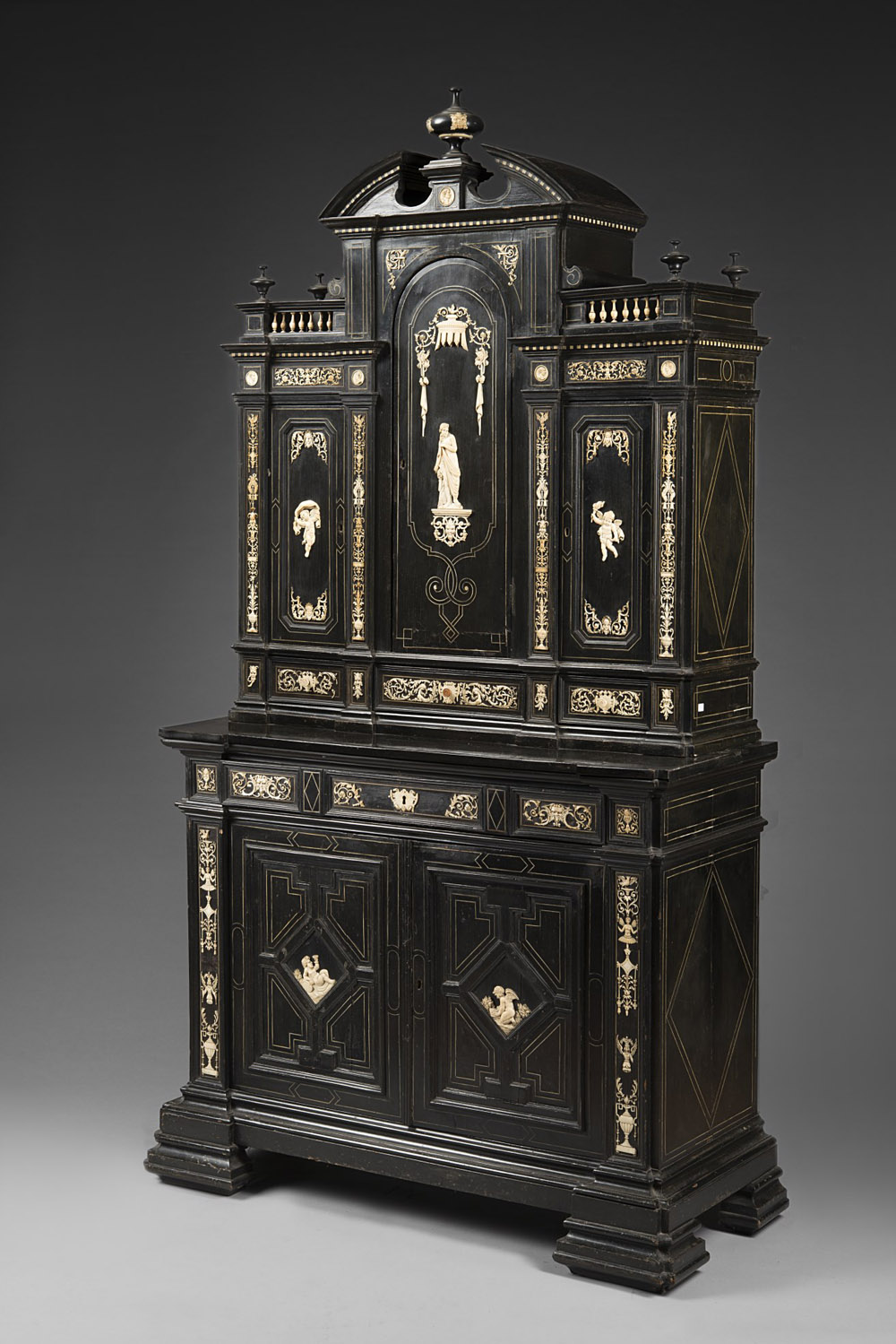 Mobile a due corpi alla maniera di Ferdinando Pogliani con parte superiore di struttura architettonica a tre ante decorate da fregi in avorio applicato, scolpito e traforato a raffaellesche, motivi virili, putti e vestale. Parte inferiore ad un cassetto e due ante decorate da fregi, mascheroni e allegorie con putti. Lombardia, seconda metà del sec. XIX (cm 118x214x48) (lievi difetti e restauri) Ferdinando Pogliani style cabinet. Lombardy, second half of the 19th century (minor defects and restorations)